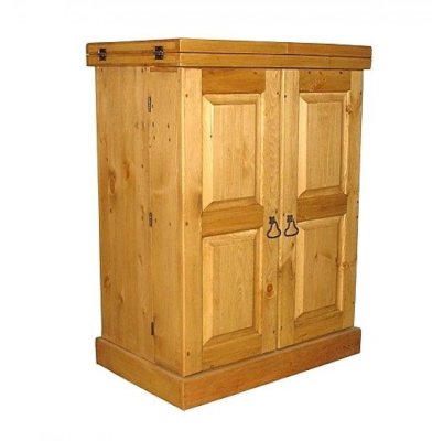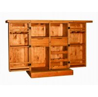 Многофункциональный готовый бар с вместительными отделениями для хранения посуды и напитков и широкой барной стойкой. При этом, он весьма компактный и не займет много места в собранном виде. При открытых дверях ширина барной стойки составляет 169 см. Торцевые части столешницы и крыльев (толщиной 4 см) укреплены поперечными вставками. Внутри бара размещены несколько полок, два ящика, полки для хранения бутылок. В дверцы сверху встроены kit-бары для хранения бокалов; ширина дверцы 40 см.