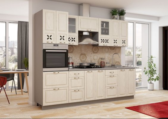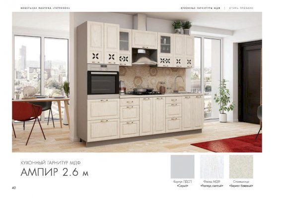 Хотите готовить и проводить время на кухне с удовольствием? Укомплектуйте помещение красивой и удобной мебелью — закажите гарнитур «Ампир»! Комплект эстетичен и функционален. В него входят все необходимые для создания идеальных условий элементы. Холодные оттенки поддерживают праздничное, романтическое настроение. Немного гламура в обстановку вносят прорезные орнаменты на дверцах подвесных шкафчиков.