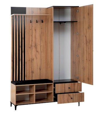 В шкафу есть открытая секция с тремя металлическими крючками, чтобы повесить верхнюю одежду. Ниже предусмотрен мягкий элемент, чтобы можно было присесть и снять обувь или просто поставить сумку. В закрытой секции - выдвижная штанга и шляпная полка. Выдвижная штанга выдерживает вес до 16 кг. Снизу предусмотрены два вместительных выдвижных ящика с шариковыми направляющими. Ящики можно использовать для хранения обуви и обувных аксессуаров.