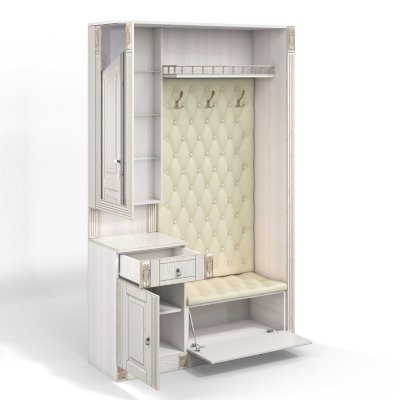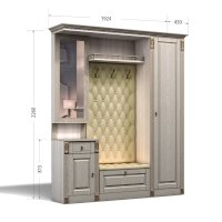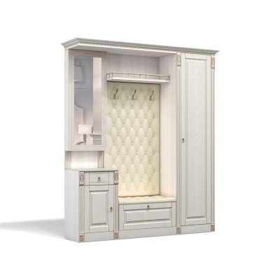 Прихожая выполнена в классическом стиле с декоративными элементами. Фасады и декоративные элементы патинированы, патина наносится вручную, по классической итальянской технологии и защищена матовым лаком. Мягкие элементы (вешалка и сиденье) выполнены из экокожи, декорированы каретной стяжкой.