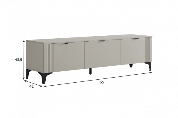 Тумба оснащена тремя распашными дверцами, которые открывают доступ к просторным внутренним полкам, идеально подходящим для хранения посуды, бытовой техники, аксессуаров или других предметов. Металлические ручки придают изделию современный вид и удобство в использовании.