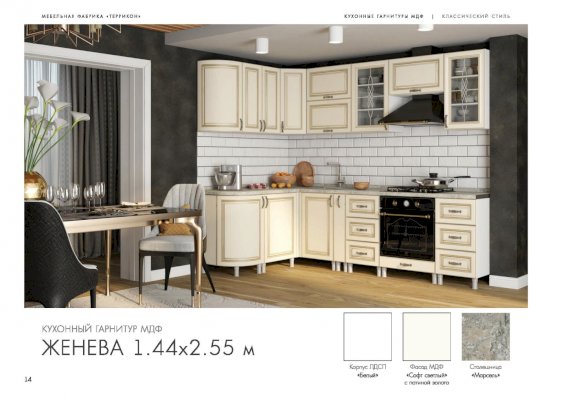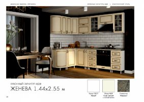 Кухонный гарнитур «Женева» превращает процесс приготовления пищи в настоящий праздник. В комплект входят все модули, необходимые для правильной организации пространства кухни. Удобная и красивая мебель вдохновляет человека на создание кулинарных шедевров. Изящные рисунки на стеклянных дверцах навесных шкафчиков наполняют классический стиль особым шармом.