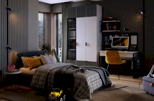 Комплектация: Полка, двухдверный шкаф, однодверный шкаф со стеклом, трехдверная антресоль, кровать, стол