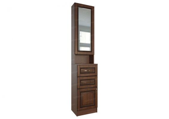 За зеркалом находится шкафчик с полками.