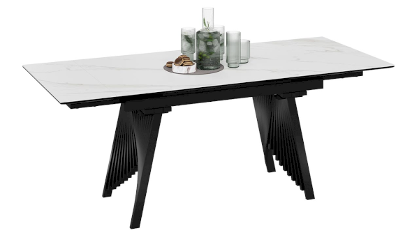 Столешница и торцевые вставки выполнены из МДФ 16 мм с керамогранитом 6 мм. Керамогранит отличается высокой прочностью, долговечностью, надежностью и термостойкостью. Он не требует особого ухода и не подвержен повреждениям при регулярном использовании. Опора необычной формы выполнена из металлических трубок, соединённых между собой в единую плиссированную конструкцию и окрашена порошковой краской «Черный муар».