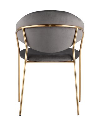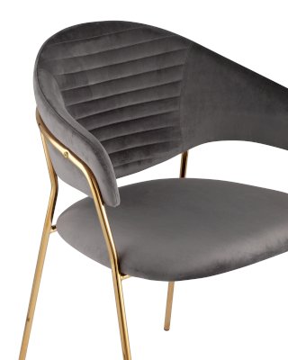Стильный кухонный стул с оригинальной формой спинки, высокой поддержкой и подлокотниками. В качестве обивки используется мягкий вельвет. Металлический каркас золотого цвета огибает спинку и выступает аккуратным акцентом модели. Широкое сиденье обеспечивает удобную посадку и уют.