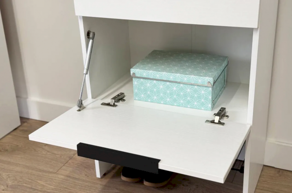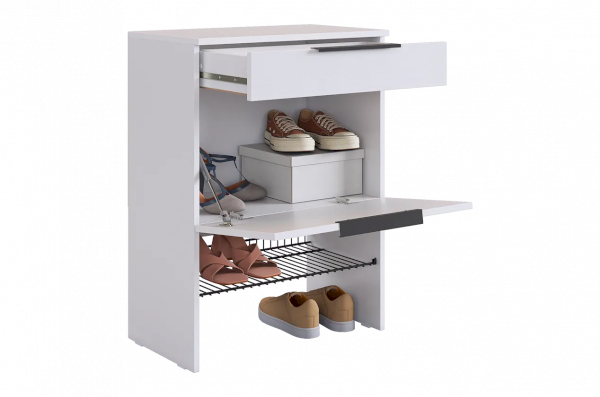 Изготовленная из прочного ЛДСП толщиной 16 мм, обувница обеспечивает надежность и долговечность. Выкатной ящик на шариковых направляющих позволяет легко и плавно открывать и закрывать его, предоставляя дополнительное место для хранения мелочей.