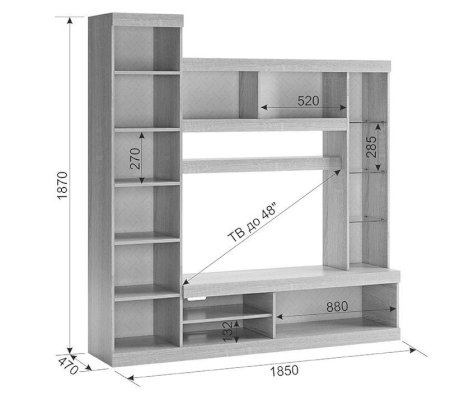 Состоит из: место под телевизор, витрина со стеклом, 4 шкафа с дверцами, открытые полки для аксессуаров, ниши под аудио-, видеотехнику.